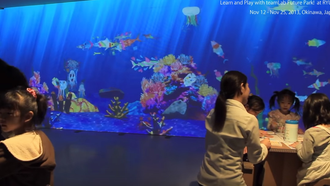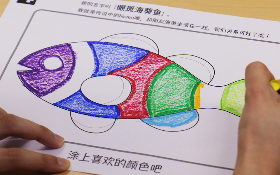 ぬり絵をすると命が吹き込まれ、壁に投影された大きな海で泳ぎ出します。